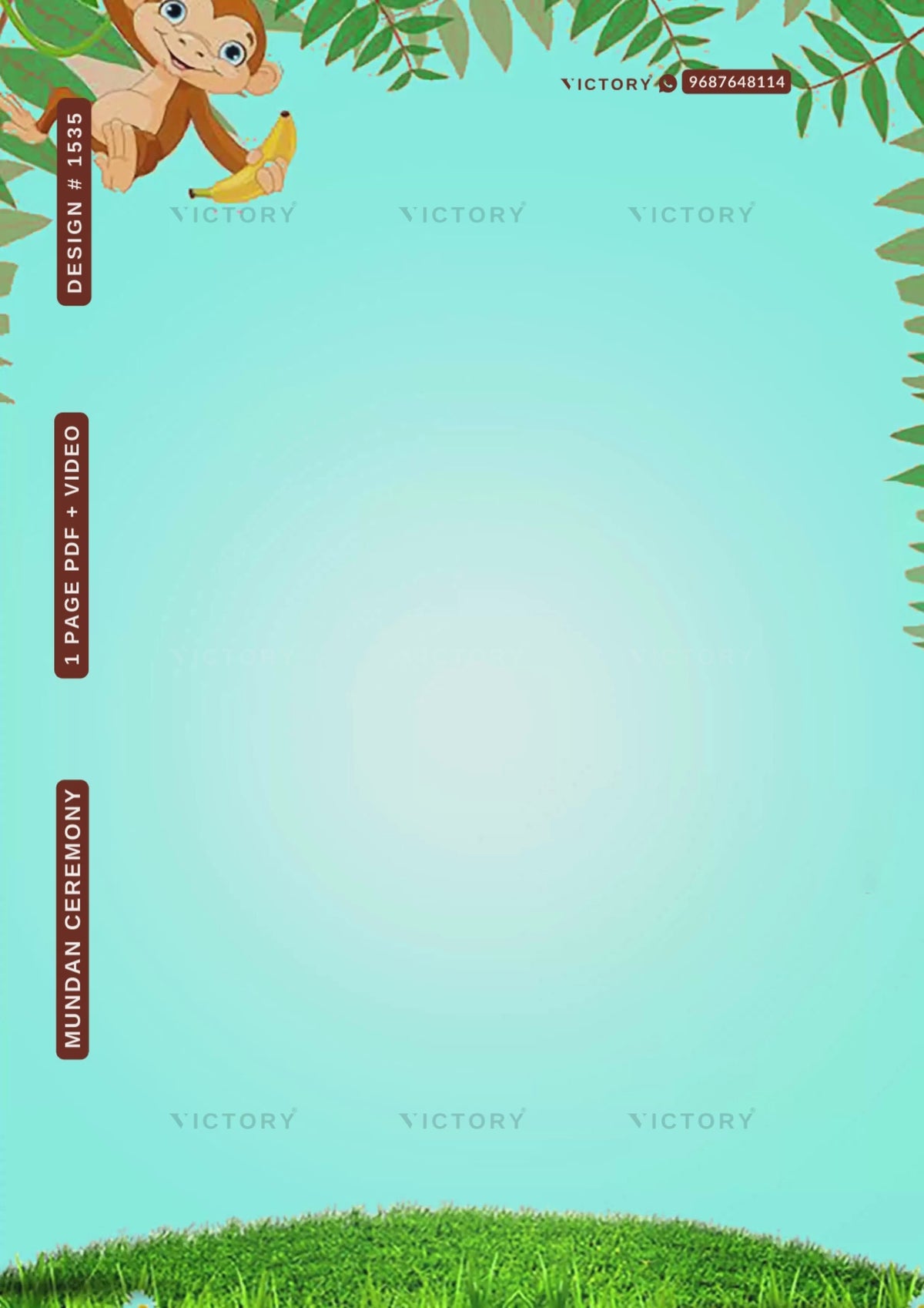 The cartoon Theme of Mundan Ceremony digital invitation card in pastel blue background color. This chudakarana ceremony e-invite is available in english language. This chadakarana or chaul kriya ceremony card includes elements such as green leaves, Chota Bheem cartoon, Mickey Mouse, and baby boy images, grass, flowers, monkey.