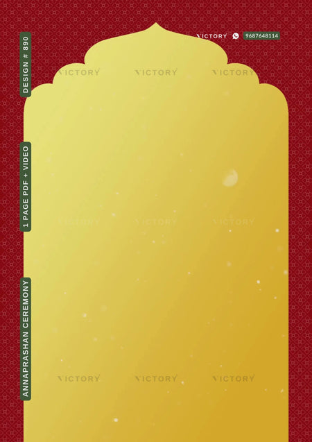 The arch frame Theme of the Annaprashan ceremony digital invitation card is in yellow, a red background color. This Rice ceremony e-invite is available in the English language. This annaprasana sanskar ceremony includes elements such as the Ganesha logo, banana leaves, marigold garland, bells, and rice feeding doodle.