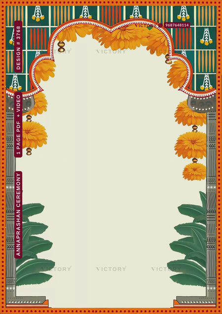 The traditional Theme of the Annaprashan ceremony digital invitation card in light yellow background color. This Rice ceremony e-invite is available in the English language. This annaprasana sanskar ceremony includes elements such as rice feeding doodle, banana leaves, orange flowers, an arch frame, ganesha logo.