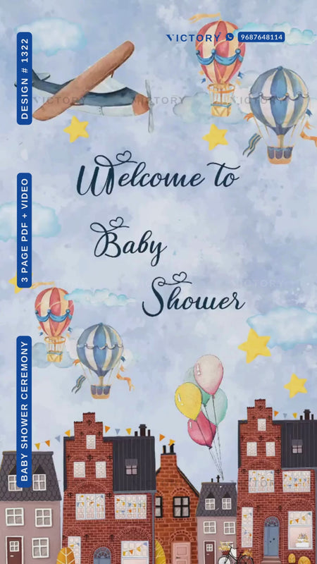 The cartoonish Theme of the Baby Shower ceremony digital invitation card on a sky blue background color. This e-invite card is available in the English language. It includes elements such as plane, hot air balloons, star, balloons, cloud, house, moon, and elephants.