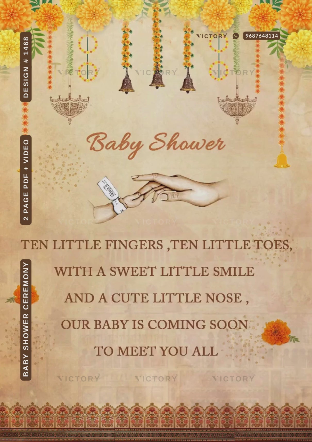 Baby Shower ceremony invitation card in english language with umbrella, hands as floral theme design 1468