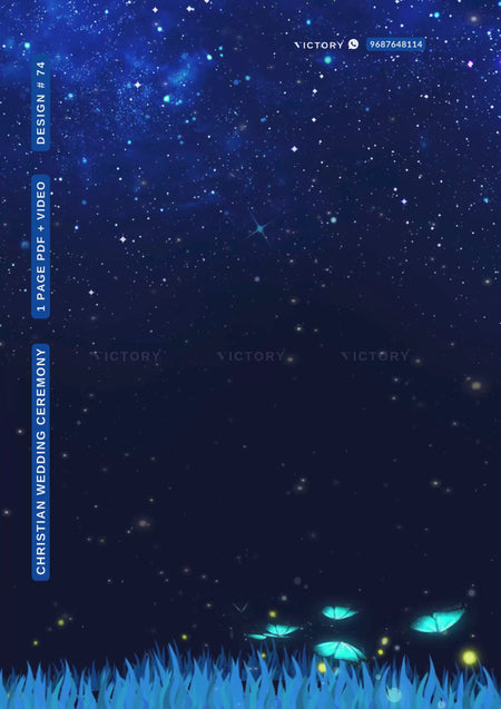 The Night view Theme of the bible verse Christian digital invitation animated video for a church wedding ceremony in Navy blue background color. This e-invite video is perfectly suitable for Catholic families and it's available in English language. It includes elements such as Couple doodle, a wooden ring, blue grass, a butterfly, purple flowers, pink flowers, a lantern, a white sparkle, couple ring.