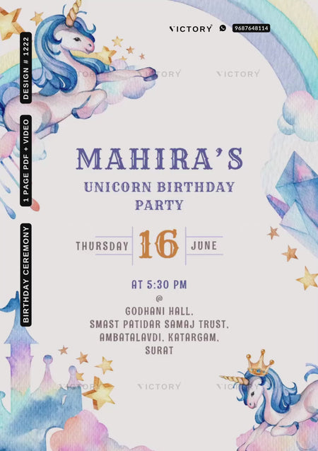 Birthday party invitation card for girl in english language with unicorn theme design 1222