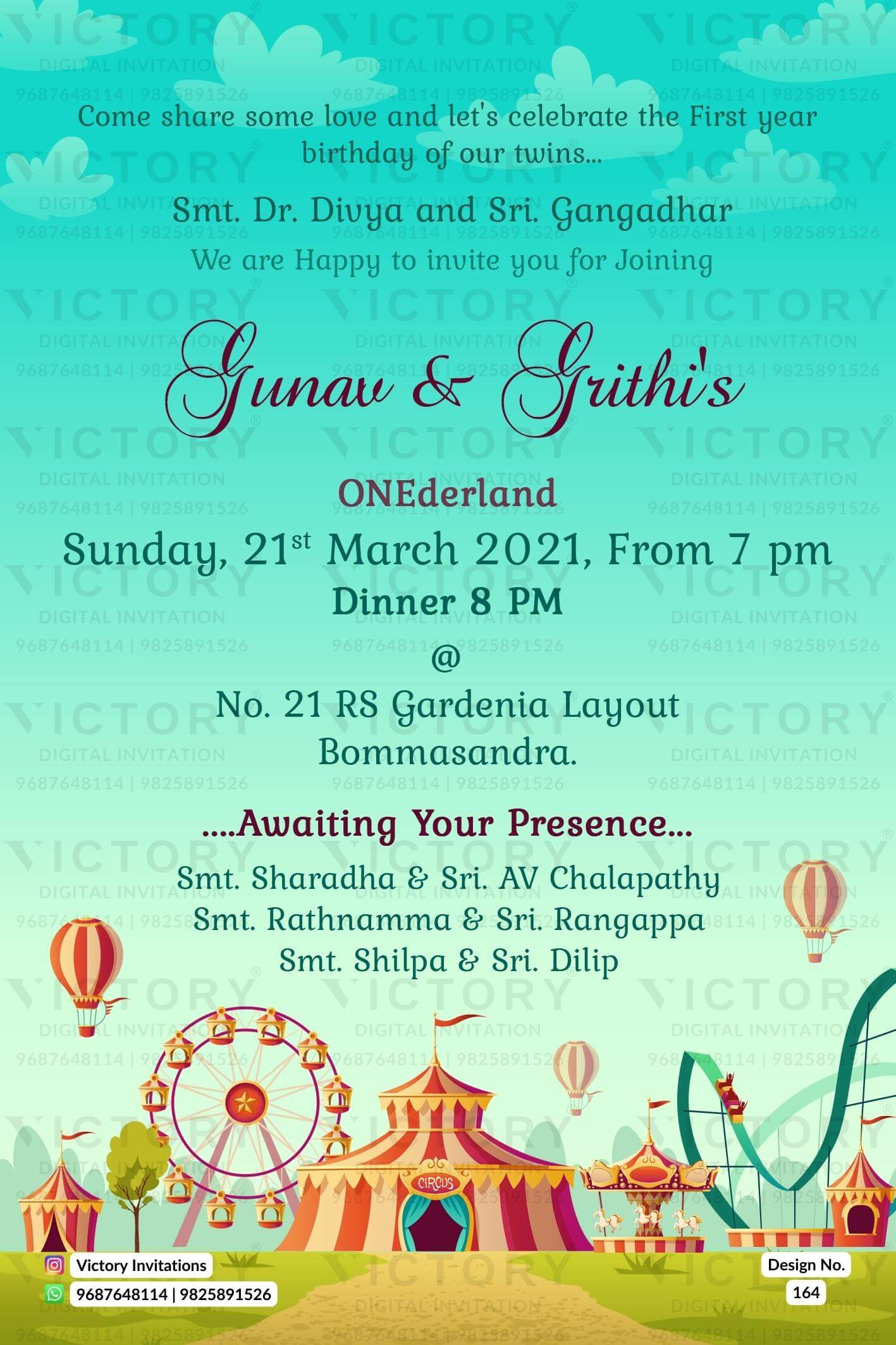 The carnival Theme of 1st Birthday party digital invitation card in cyan background color. This birthday party e-invite is available in the English language. Happy birthday, the invitation includes elements such as hot air balloons, Ferris wheel, carousel, rollercoaster, and cloud.