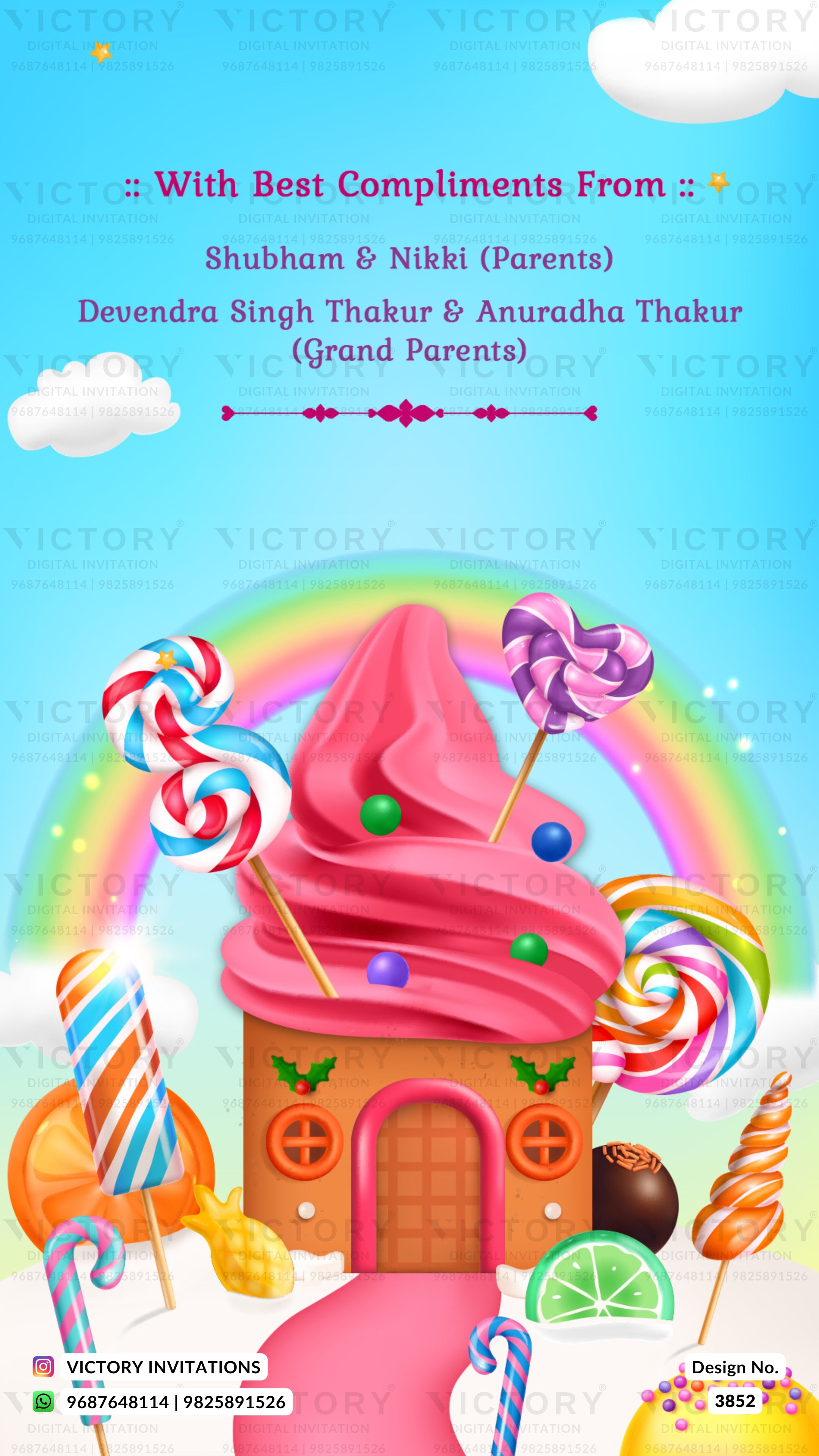 The rainbow Theme of the 1st Birthday party digital invitation card in sky blue background color. This birthday party e-invite is available in the English language. Happy birthday, the invitation includes elements such as cloud, candy, chocolate, rainbow.