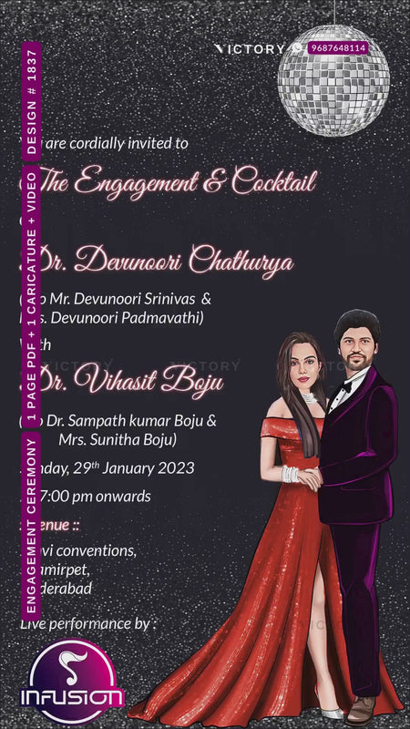 Bollywood couple caricature invitation card for Engagement ceremony in Englsih language with Dancing ball as glittery theme design 1837