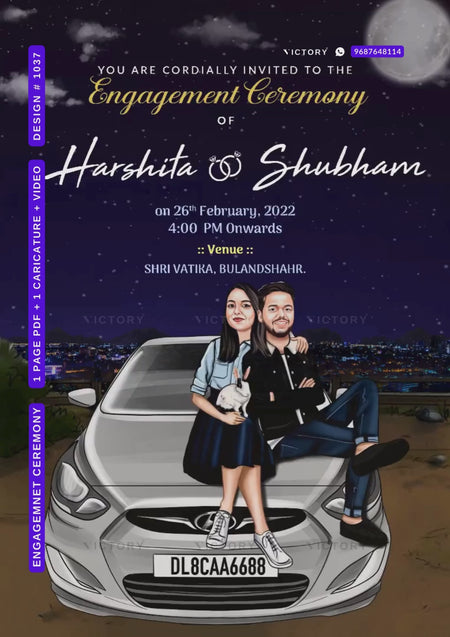 Bollywood couple caricature invitation card for Engagement ceremony in Englsih language with moon, car as night theme design 1037
