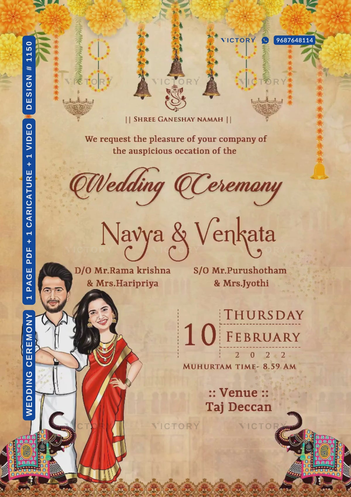 Charming couple caricature invitation card for the wedding ceremony of Hindu south indian telugu family in english language with marigold floral theme design 1150