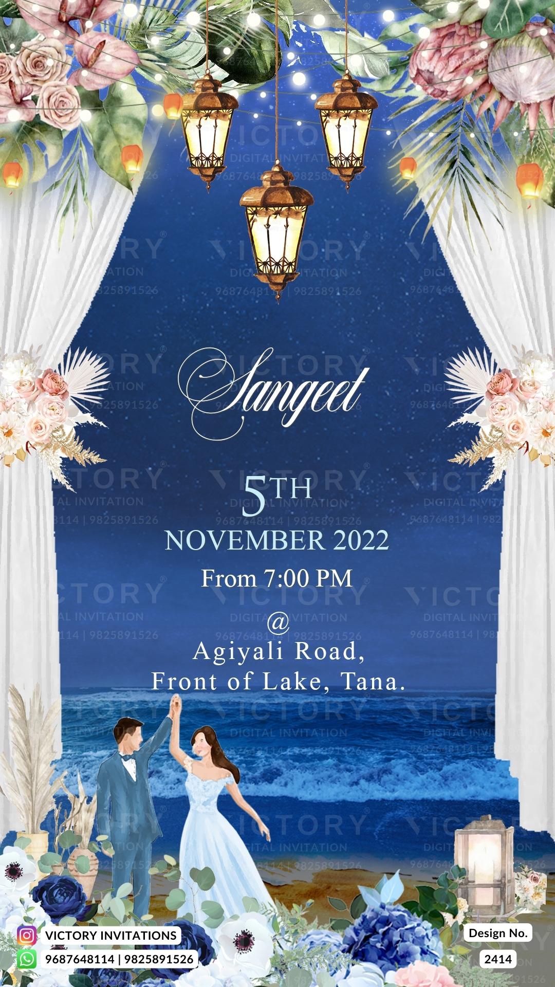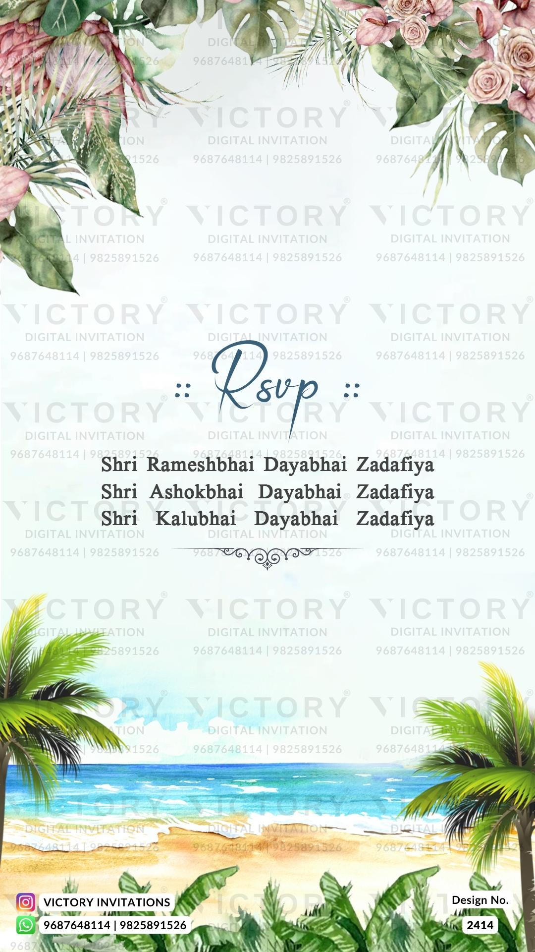 The Beach Theme of the Hindu Gujarati Charming couple caricature digital invitation card for wedding ceremony in green, orange, navy blue, pink splash, sky blue background color. This e-invite card is perfectly suitable for the Patel family and it's available in the English language. It includes elements such as a couple logo, green leaves, pink flowers, a coconut tree, a beach, string lights, a lantern, white curtains, a sangeet couple doodle, blue flowers, white flowers, yellow flowers, grey pillars, haldi doodle, wedding couple doodle, Mayra.