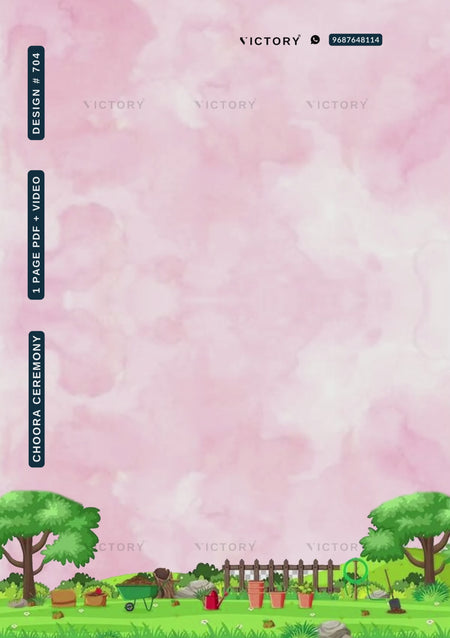 The garden Theme of the Choora ceremony or Bangle ceremony digital invitation card in pastel pink background color. This Chura ceremony invite is for the Punjabi family and it is available in English language. This Kaleerey ceremony e-invite includes elements such as bells, marigold garland, traditional girl doodle, fence, and grass.