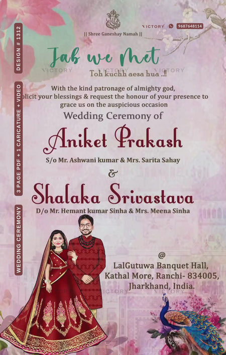 The Traditional Theme of the Hindu East indian Delightful Couple caricature digital invitation card for wedding ceremonies in pink splash, and purple splash background color. This e-invite card is perfectly suitable and it's available in the English language. It includes elements such as the Ganesha logo, birds, peacocks, pink flowers, a sangeet couple doodle, an angel, green leaves, a teddy bear, a ball, a boat, wooden table.
