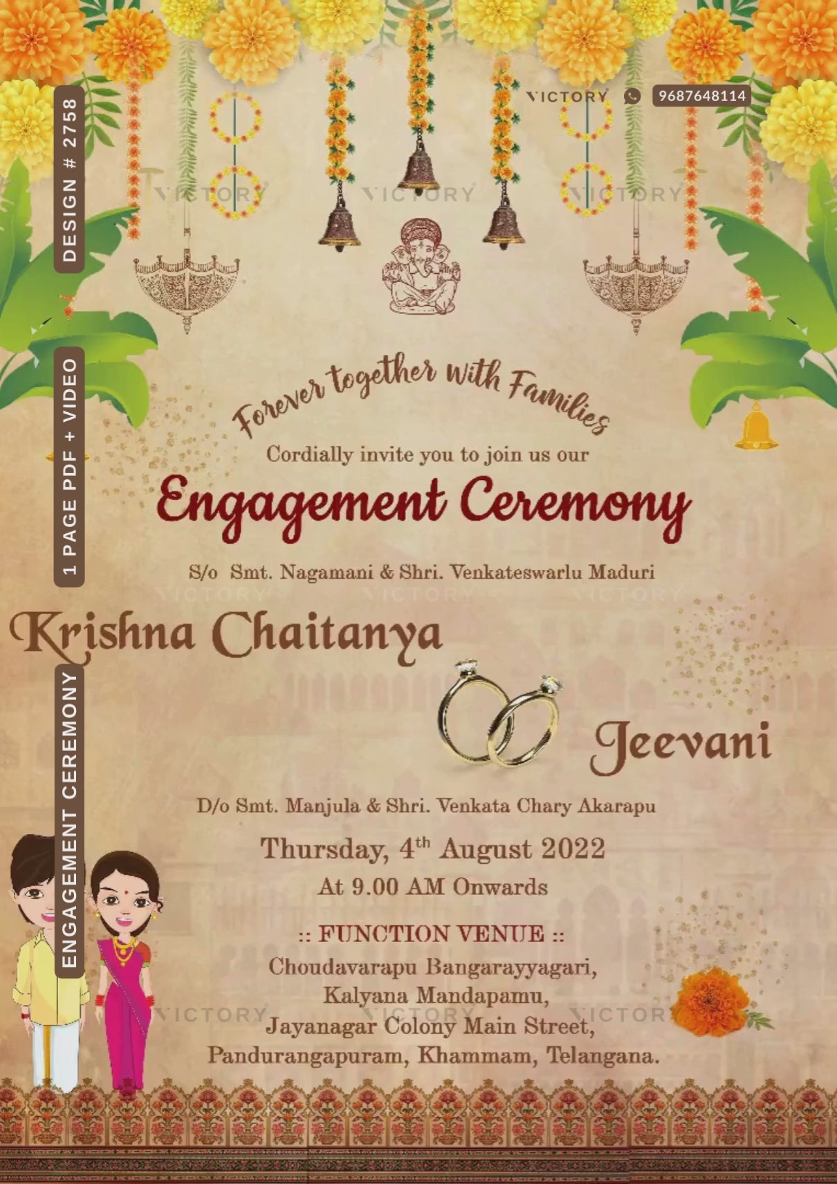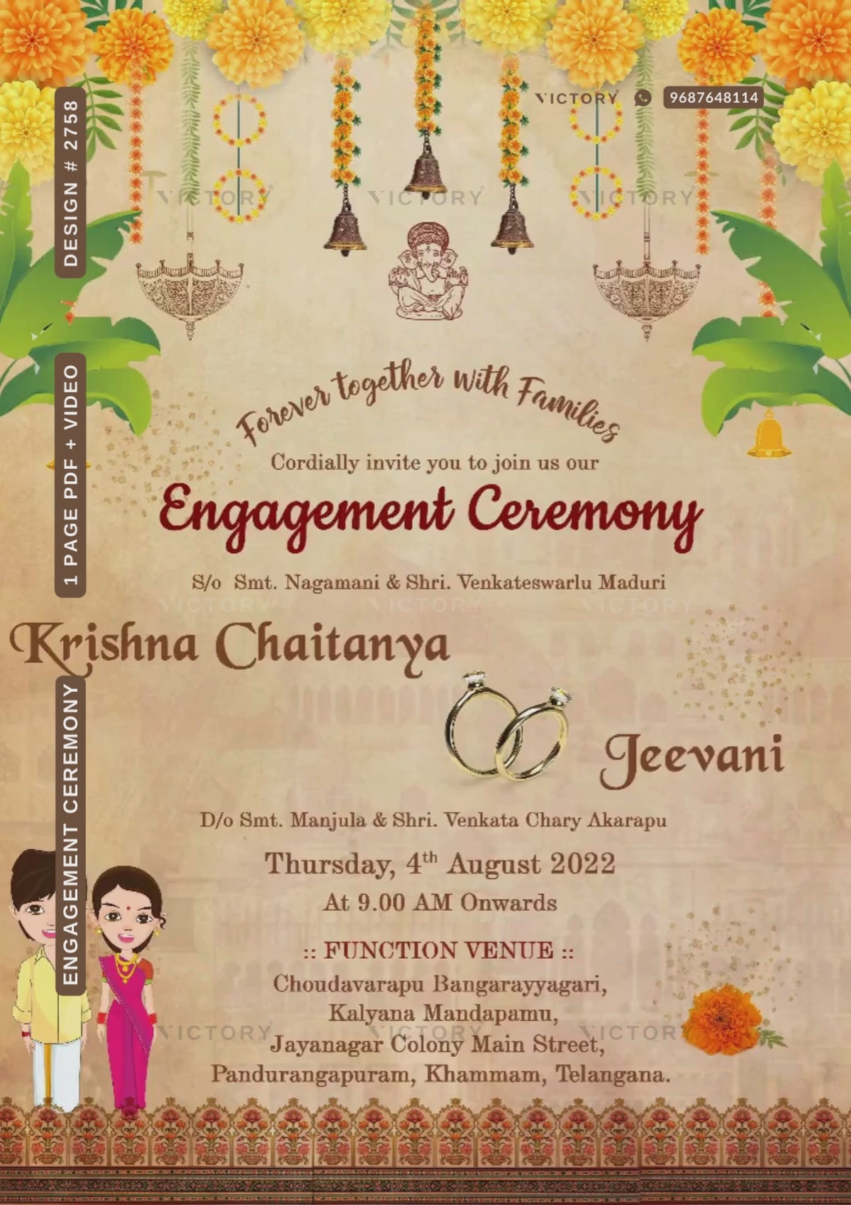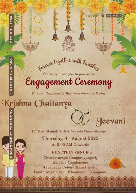 The marigold flowers Theme of Engagement ceremony digital invitation card in beige background color. It is available in English language. It includes elements such as banana leaves, couple doodle, bells, umbrella, traditional border, ganesh icon, ring.