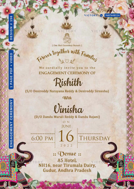 Engagement ceremony invitation card in english language with elephant, flowers as vintage theme design 156
