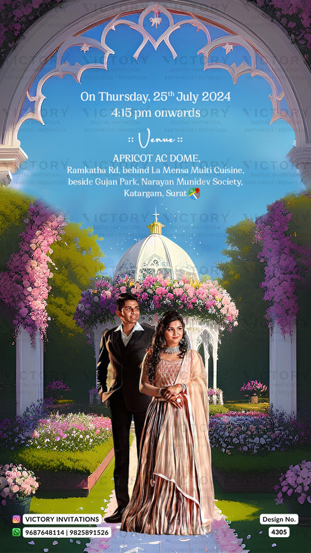 The garden Theme of Engagement ceremony digital invitation card in sky blue background color. This e-invite is available in English language. It includes elements such as flowers, temple,couple logo, gate and couple photo.