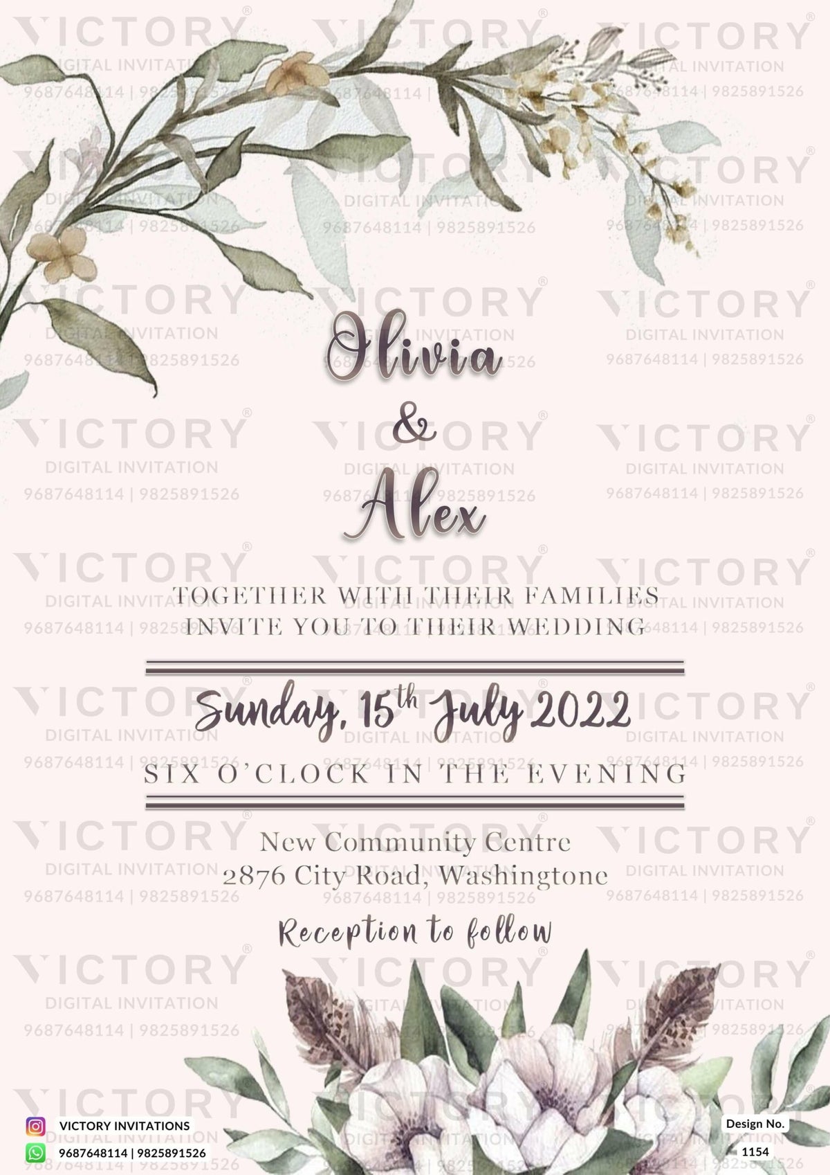 Engagement ceremony invitation card in english language with green leaves, couple ring as floral theme design 1154
