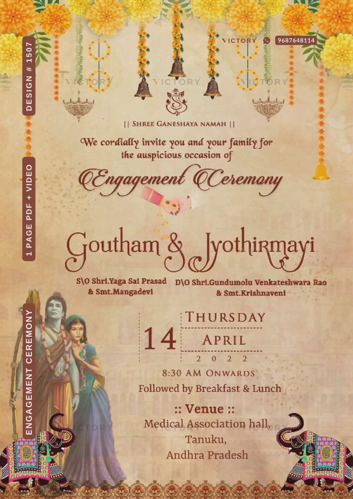 The marigold flowers Theme of Engagement ceremony digital invitation card in beige background color. It is available in English language. It includes elements such as marigold flowers, umbrella, god images, elephant, bells, leaves, ganesh icon, and traditional border.