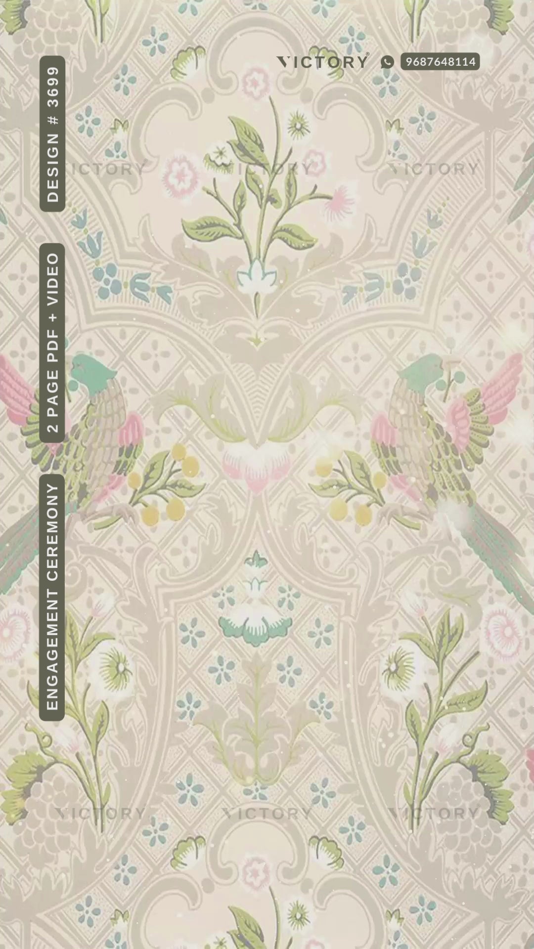 The vintage Theme of the Engagement ceremony digital invitation animated video in cream background color. This Engagement e-invite video is available in the English language. This motion invitation video includes elements such as green leaves, and birds.
