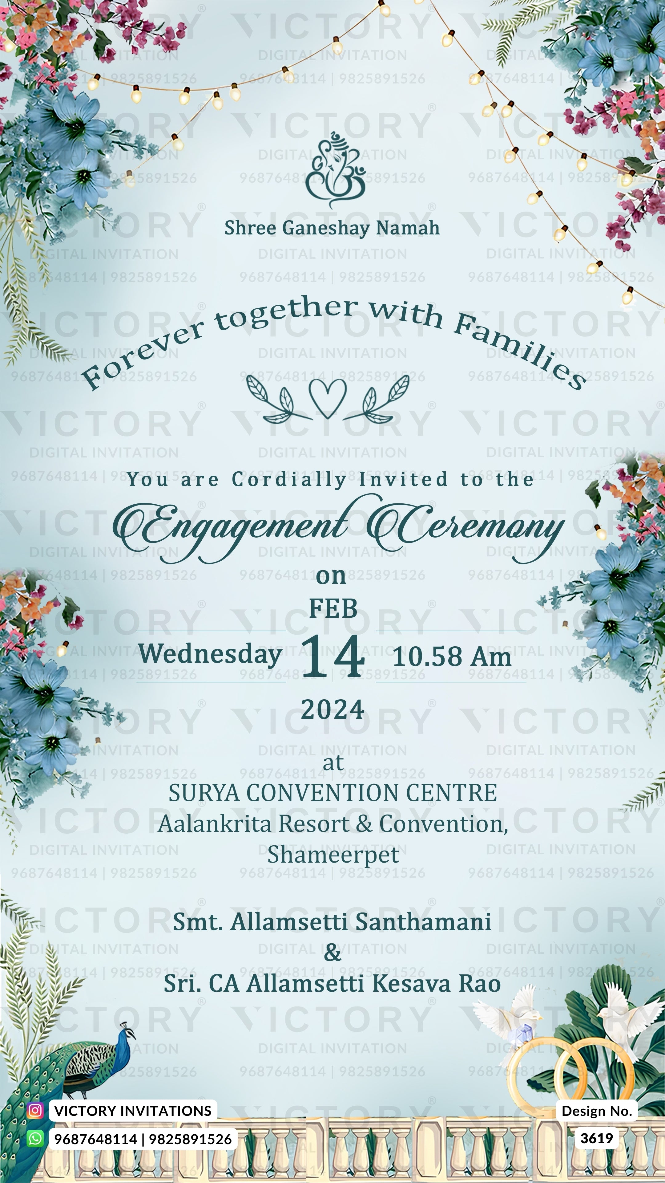 The traditional Theme of the Engagement ceremony digital invitation video with sky blue background color. This e-invite video card is available in the English language. This motion invitation video includes elements such as pink flowers, a couple logo, green leaves, a lantern, glitter, a frame, punjabi logo.