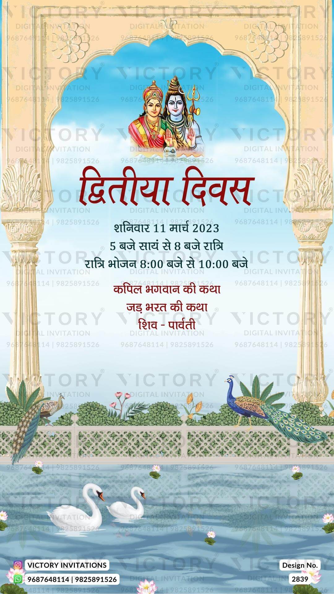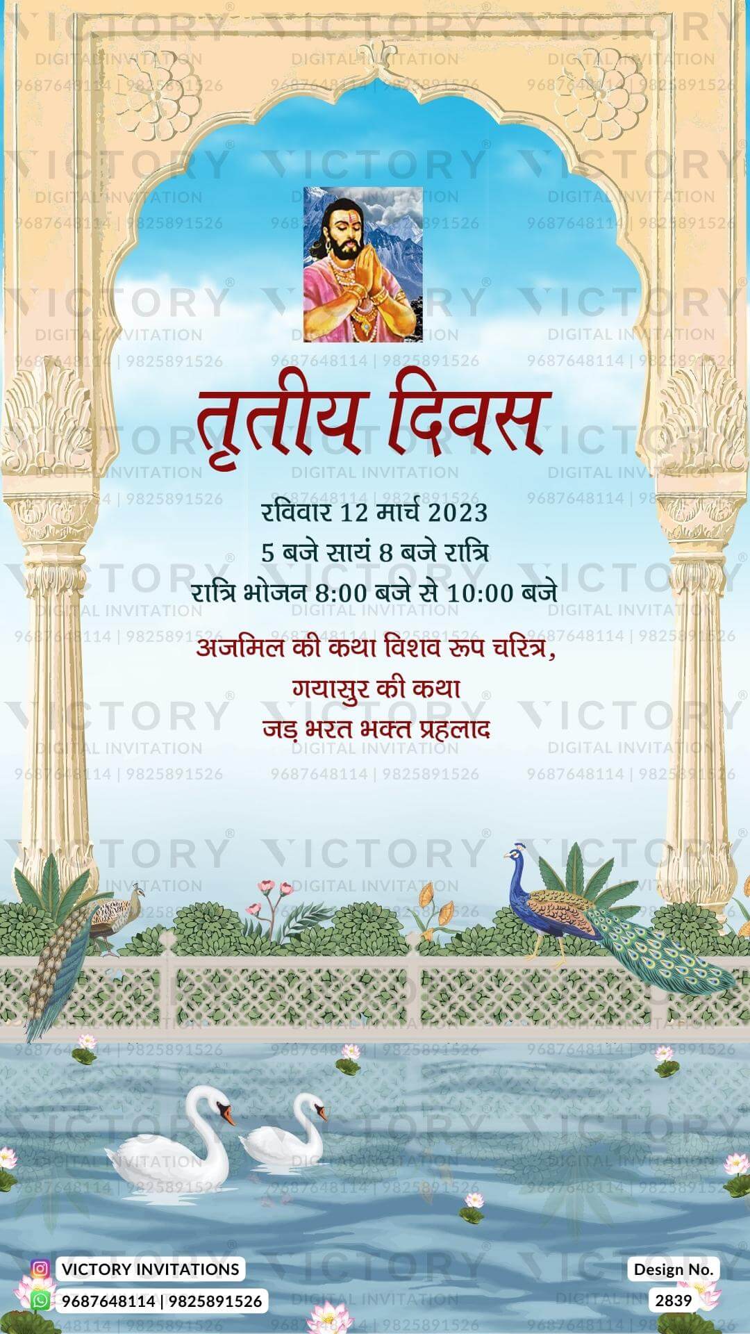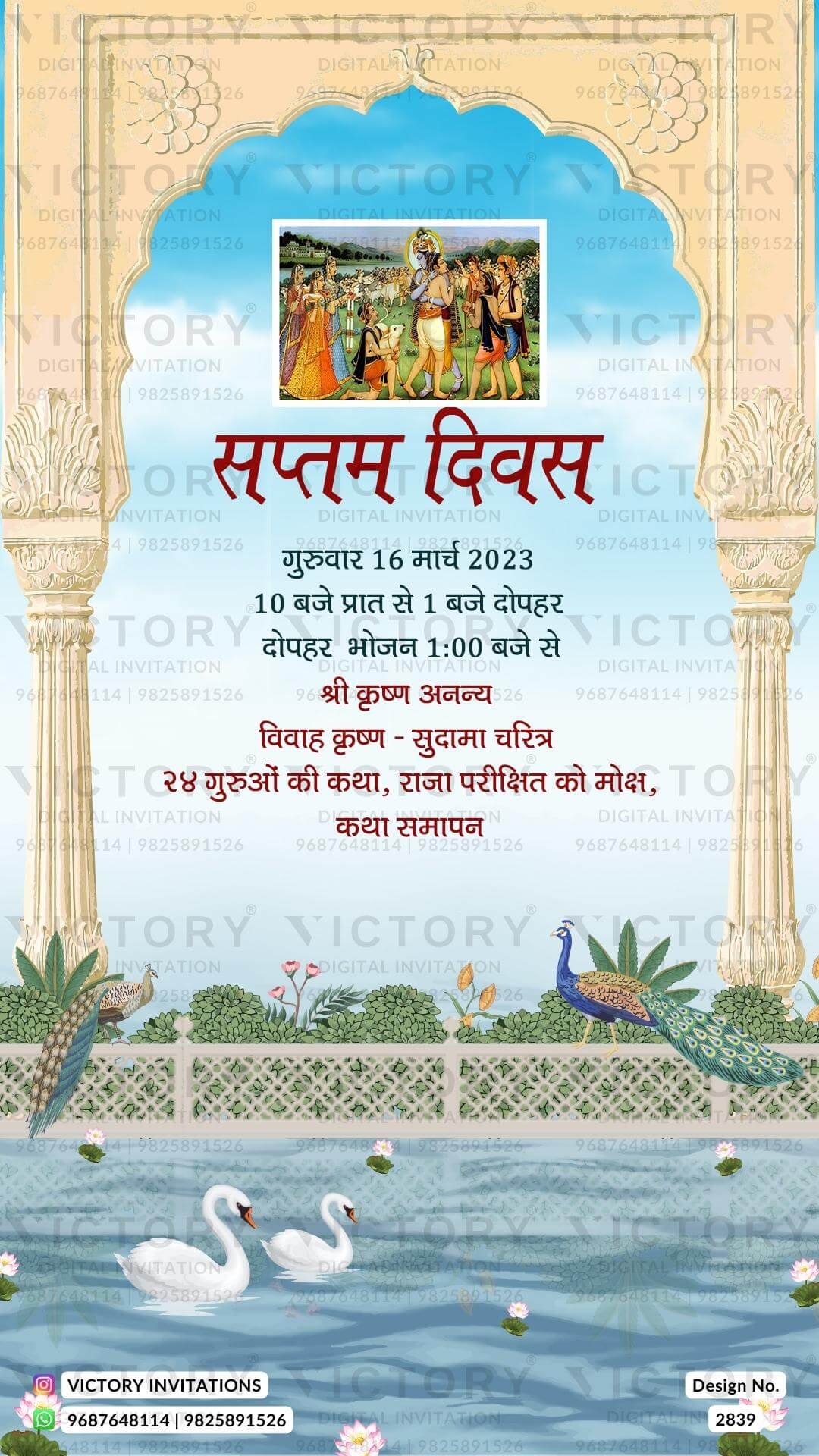 Family caricature invitation card for Bhagwat Katha in hindi language with peacock, fence, duck as gate theme design 2839