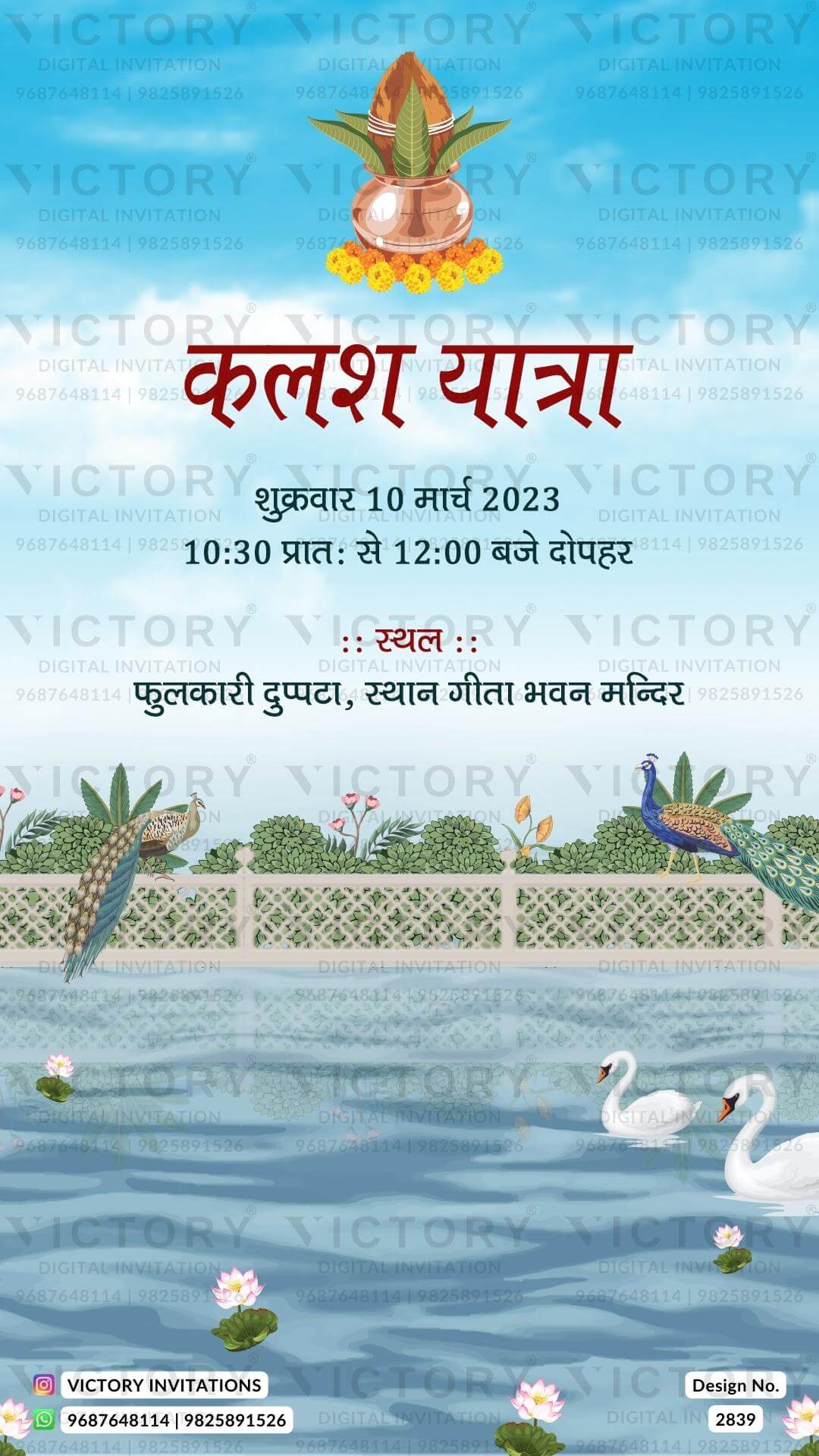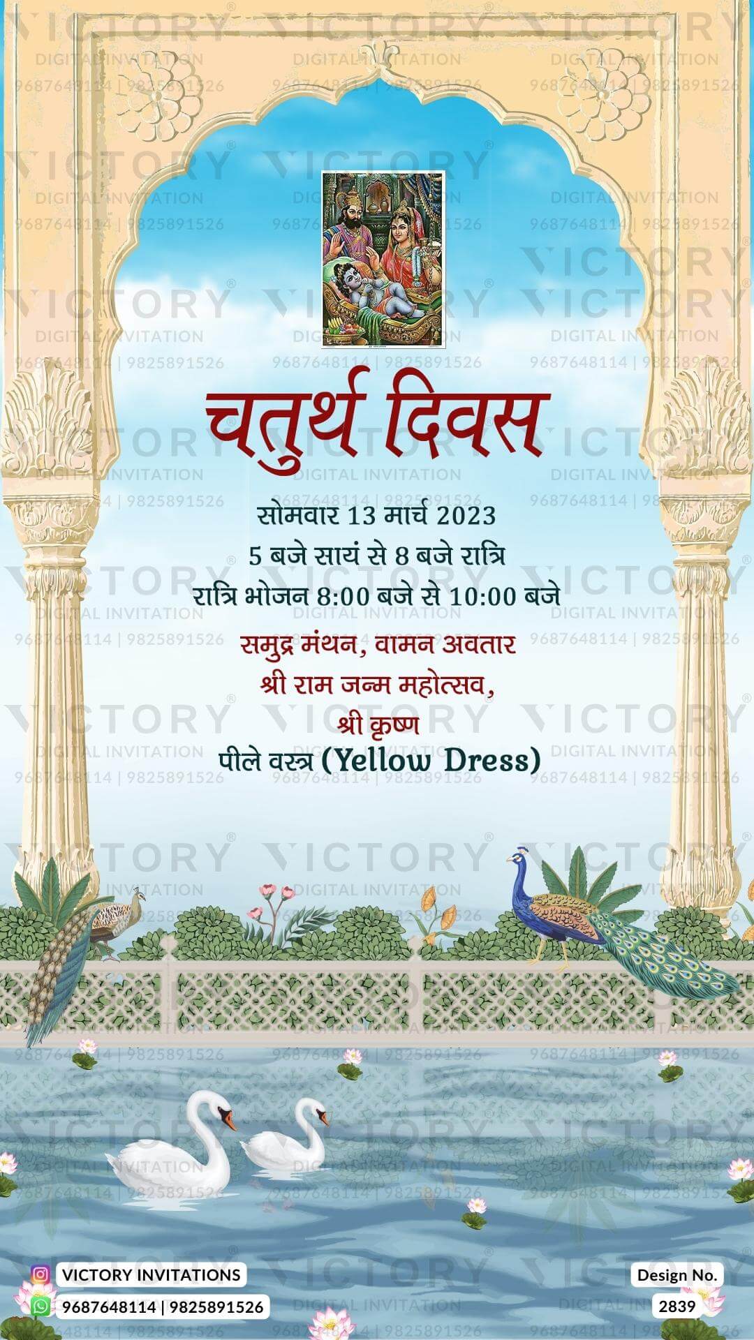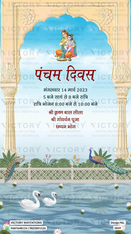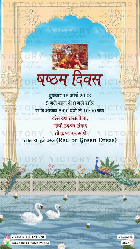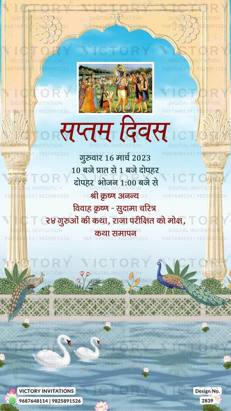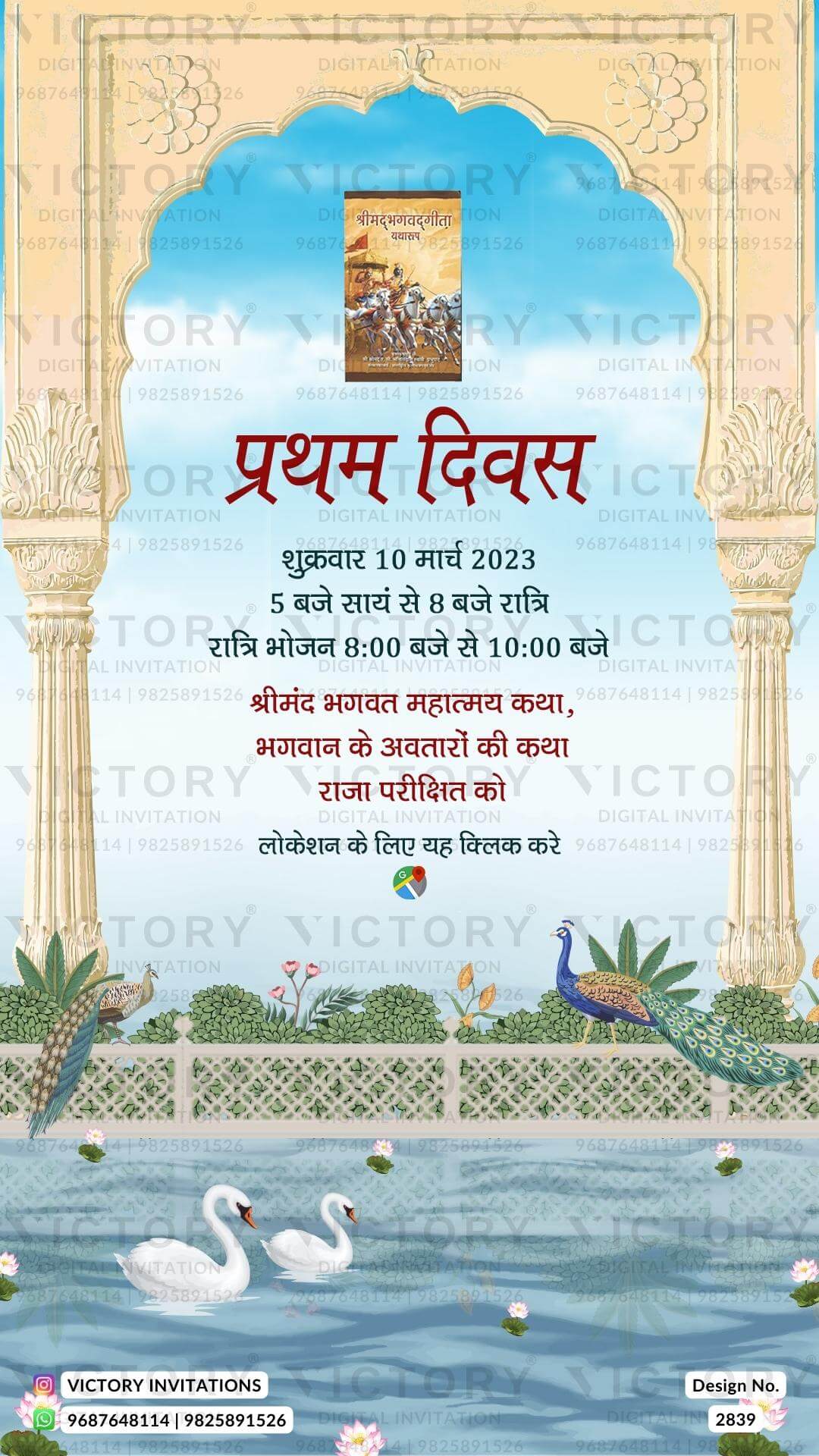 Family caricature invitation card for Bhagwat Katha in hindi language with peacock, fence, duck as gate theme design 2839