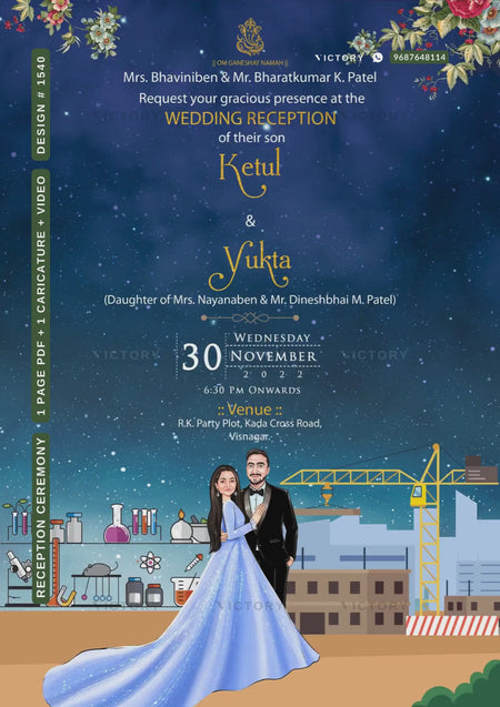 The Minimalistic Theme of the Hindu-Indian Reception Digital invitation in dark blue and light blue background colors. This e-invite card is perfectly suitable for Gujarati families and is available in the English language. It includes elements such as chemical labs and construction sites, tropical leaves and botanical flowers, and couple caricatures.