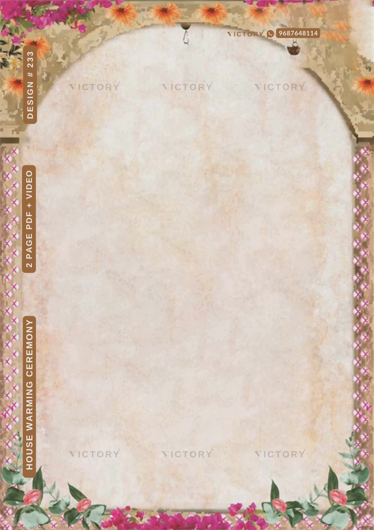 House Warming ceremony invitation card in english language with couple logo, flowers as gate theme design 233