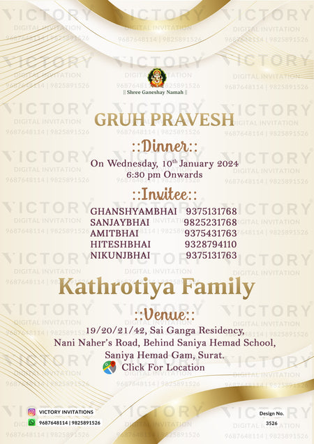 The minimalistic Theme of House Warming ceremony digital invitation card on light yellow background color. This e-invite is available in Gujarati language. It includes elements such as golden lines and, ganesha logo.