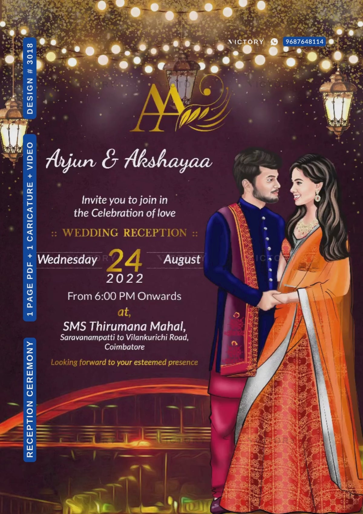The glittery Theme of the Hindu South Indian Loving couple caricatures digital invitation card for a wedding ceremony in burgundy background color. This e-invite card is perfectly suitable for Tamil family and it's available in the English language. It includes elements such as string light, lantern, sparkle, bridge, and name logo.