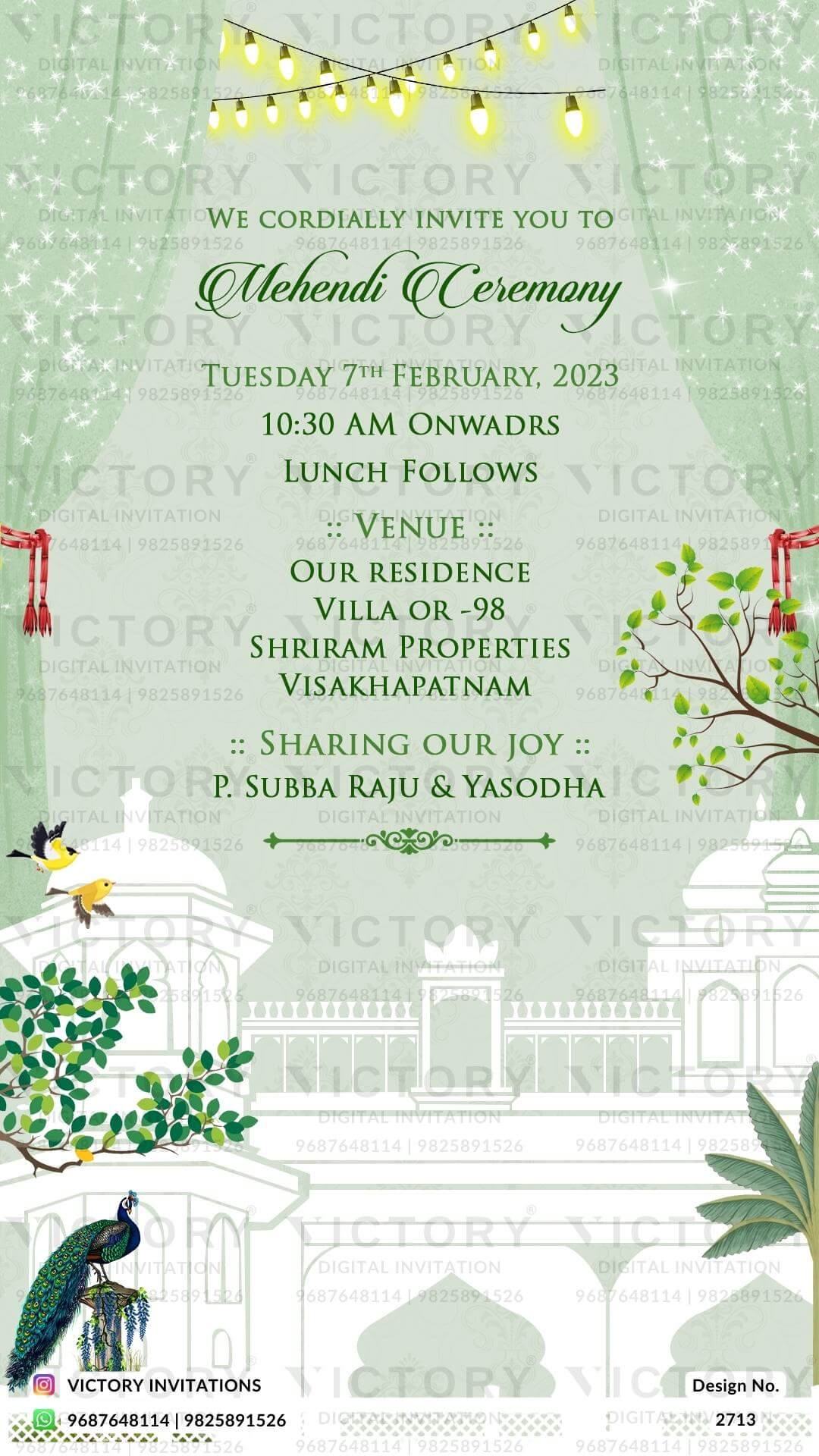 The traditional Theme of Mehendi digital invitation card in pastel green background color. This Mehndi e-invite is available in english language. It includes elements such as flowers, arch, mahal, peacock, tree, birds, lights, sparkle and curtains.