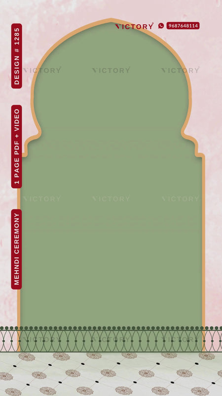 The treditional theme of the Mehendi digital invitation card in the pink and green background color. This Mehndi e-invite is available in English language. It includes elements such as mehendi hands, lanterns, flowers, the Ganesh icon, traditional doodle, leaves, and fence.