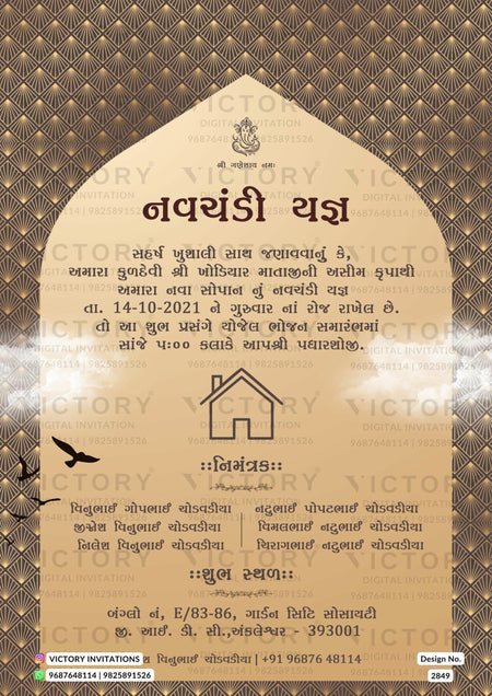 Navchandi yagna invitation card in gujarati language with birds, cloud as traditional gate theme design 2849