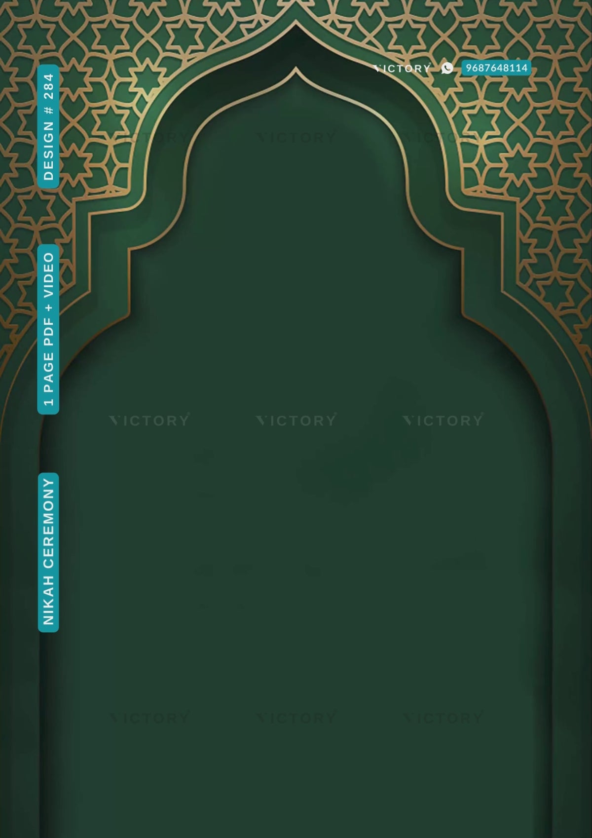 The Traditional Theme of the Islamic digital invitation card for the Nikah marriage ceremony is in Green background color. This e-invite card is perfectly suitable for Muslim families and it's available in English language. It includes elements such as a lantern, a golden arch, and a golden pattern.