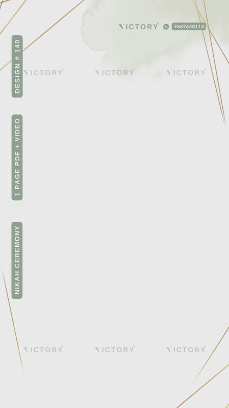 The Vintage Theme of the Islamic digital invitation card for the Nikah marriage ceremony is in white, green splash background color. This e-invite card is perfectly suitable for Muslim families and it's available in English language. It includes elements such as Engagement couple doodle, haldi couple doodle, mehendi couple doodle, nikah couple doodle, reception couple doodle, golden lines, green leaves, white flowers, and brown leaves.