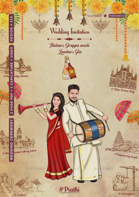 The Traditional Theme of the Hindu south indian Playful couple caricature digital invitation card for a wedding ceremony in Pastel brown background color. This e-invite card is perfectly suitable for Tamil families and it's available in the English language. It includes elements such as a Marigold garland, cheers icon, umbrella, Tower Bridge London icon, Civil engineer icon, Tanjavore big temple icon, Architech icon, bell, and Hanumanji logo.