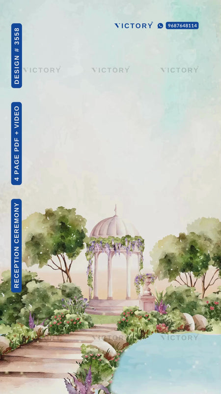 The garden Theme of the Reception Party digital invitation card in sky blue background color. This wedding reception ceremony e-invite is available in the English language. This marriage reception invitation includes elements such as the couple logo, swan, temple arch, gate, fountain, leaves, calendar, and bridge.