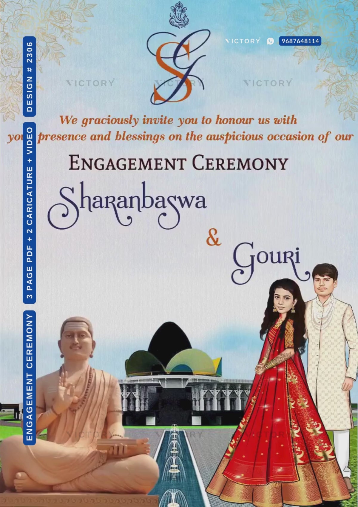 romantic couple caricature invitation card for Engagement ceremony in Englsih language with mahal, flowers as royal theme design 2306