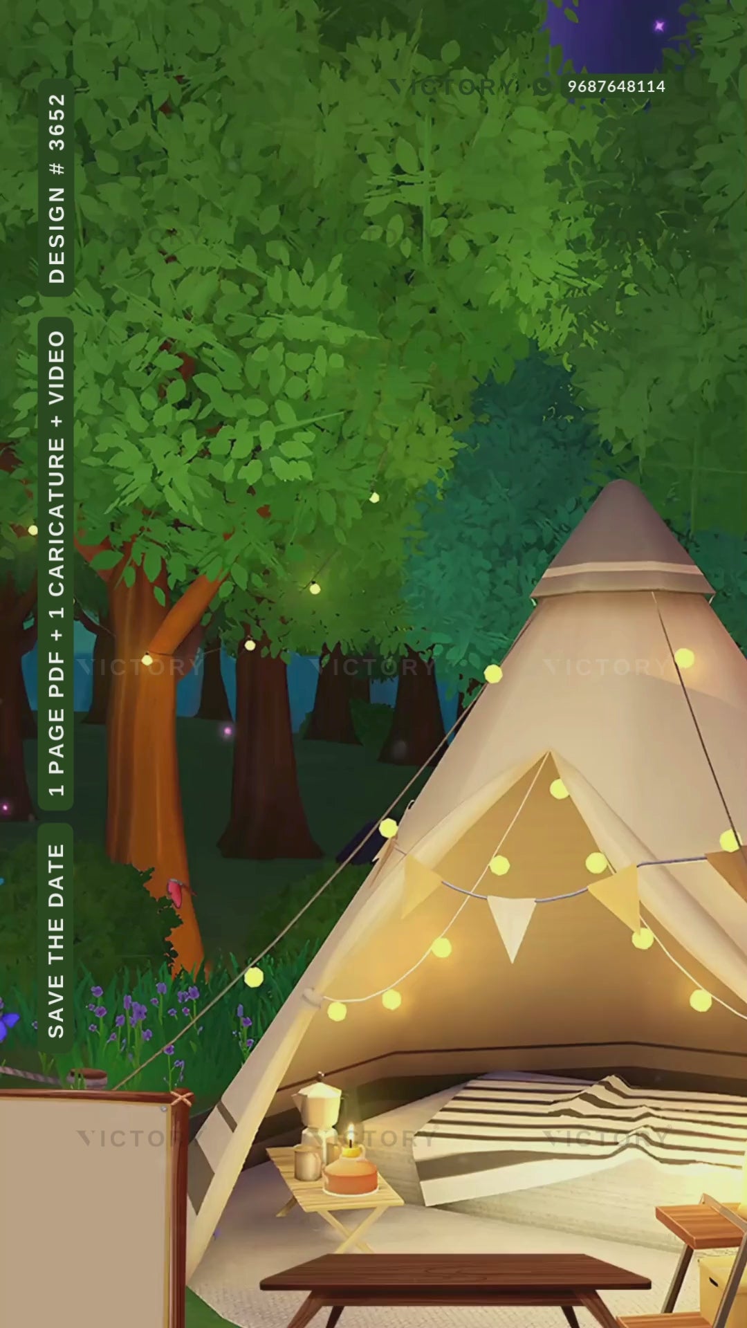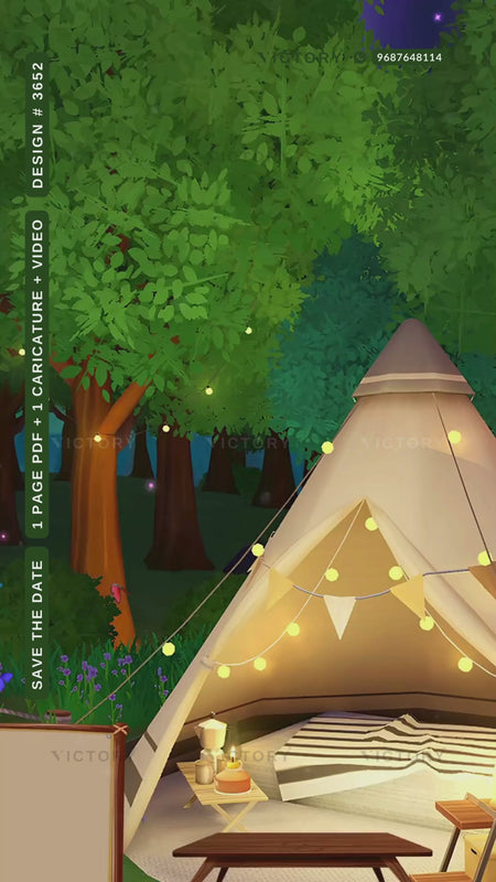 The forest Theme of a romantic couple caricature digital invitation card for Save the Date on the dark blue background color. This e-invite card is available in the English language. Save the Date wedding cards include elements such as a tree, string light, grass, couple logo, lantern, and night tent.