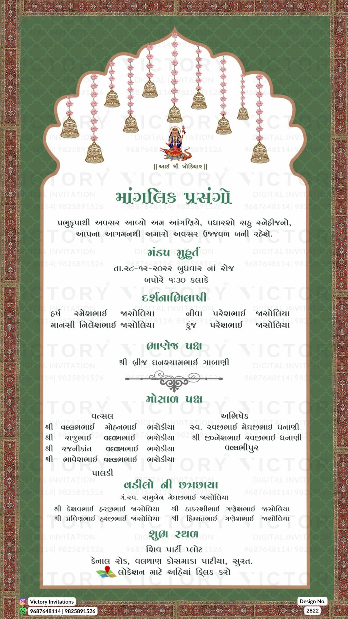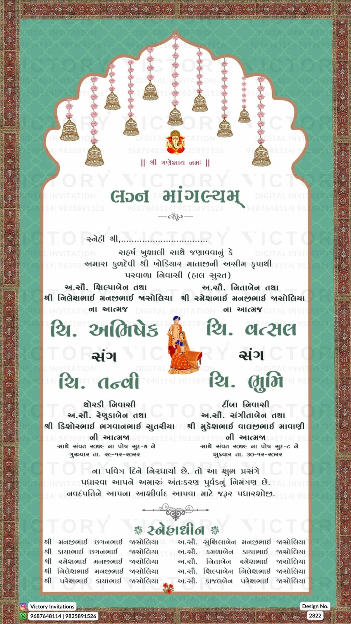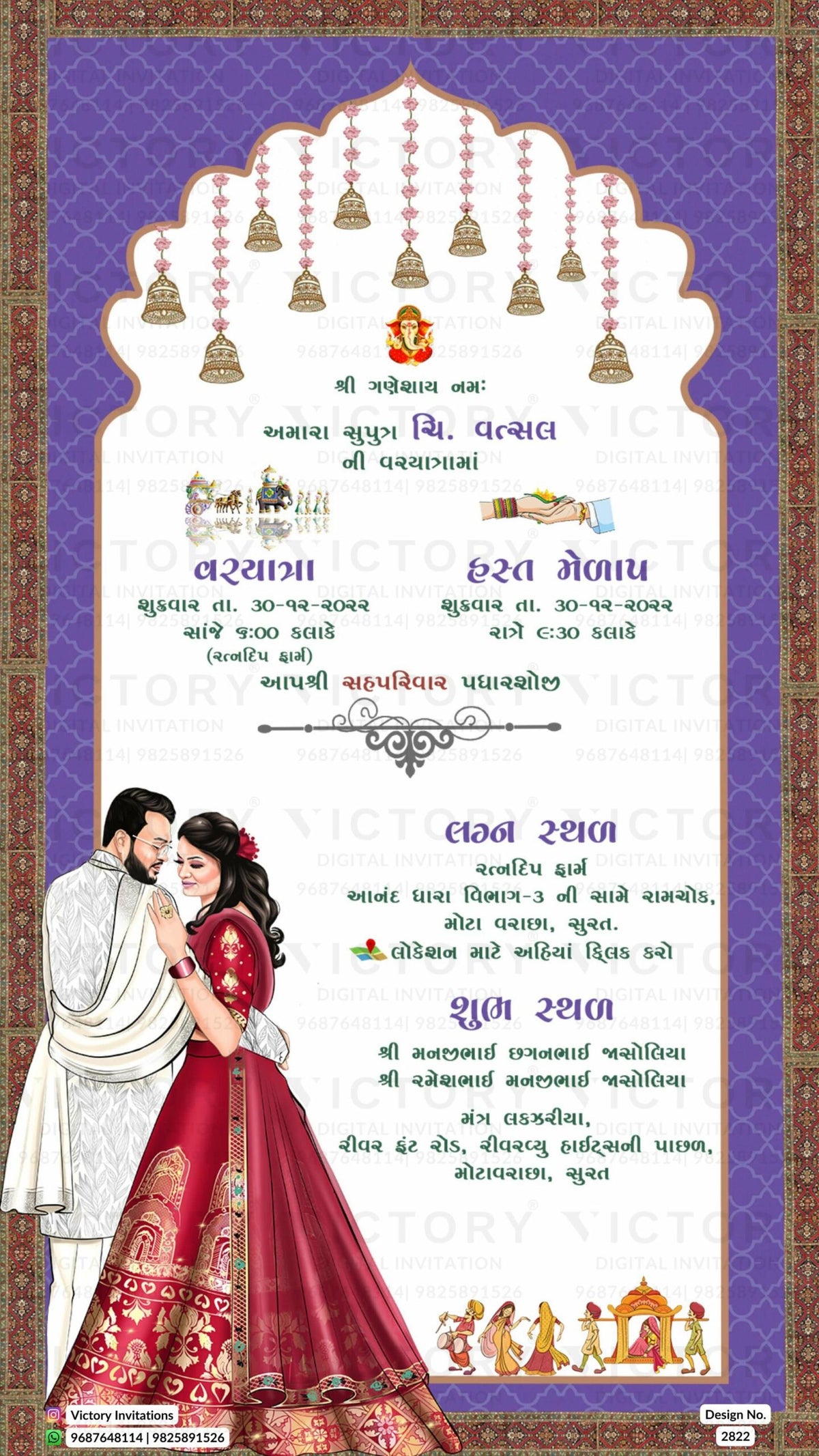 The Arch Theme of the Hindu gujarati Romantic couple caricature digital invitation card for wedding ceremony in White, red, green, blue, and purple background color. This e-invite card is perfectly suitable for the kathiyawadi family and it's available in the Gujarati language. It includes elements such as an arch, elephant, lantern, god image, wedding couple doodle, red flowers, and tabla.