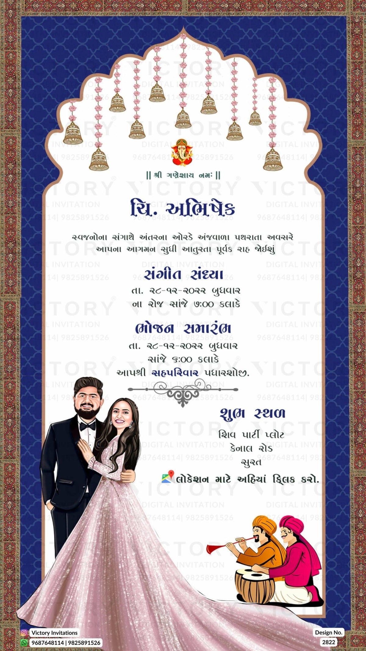 Romantic couple caricature invitation card for wedding ceremony of hindu gujarati kathiyawadi family in Gujarati language with Arch design 2822