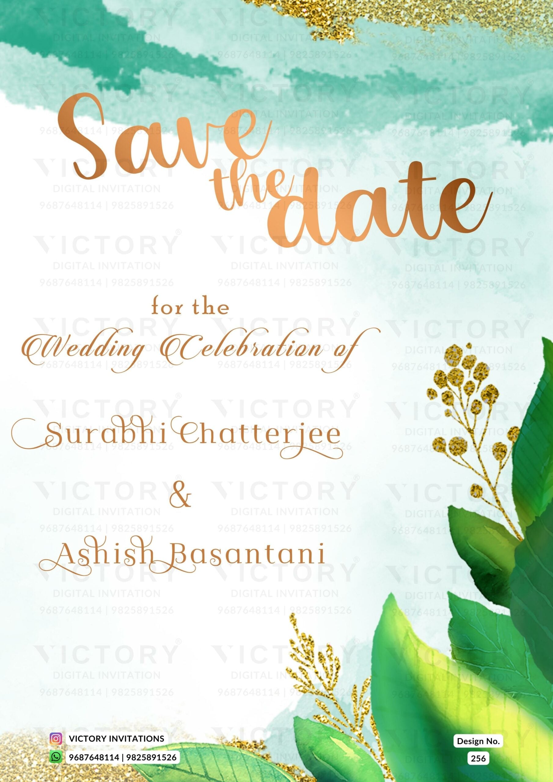 The glittery Theme of the Save the Date digital invitation card in the green background color. This e-invite is available in the English language. Save the Date wedding cards include elements such as green leaves, and glitter.