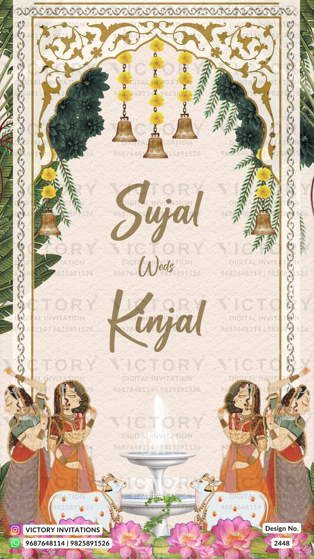 The traditional Theme of the Save the Date digital invitation card is in the beige background color. This e-invite is available in the English language. Save the Date wedding cards include elements such as bells, an arch frame, pink flowers, a peacock, a fence, yellow flowers, a couple logo, boho leaves, cows, a fountain, lotus.