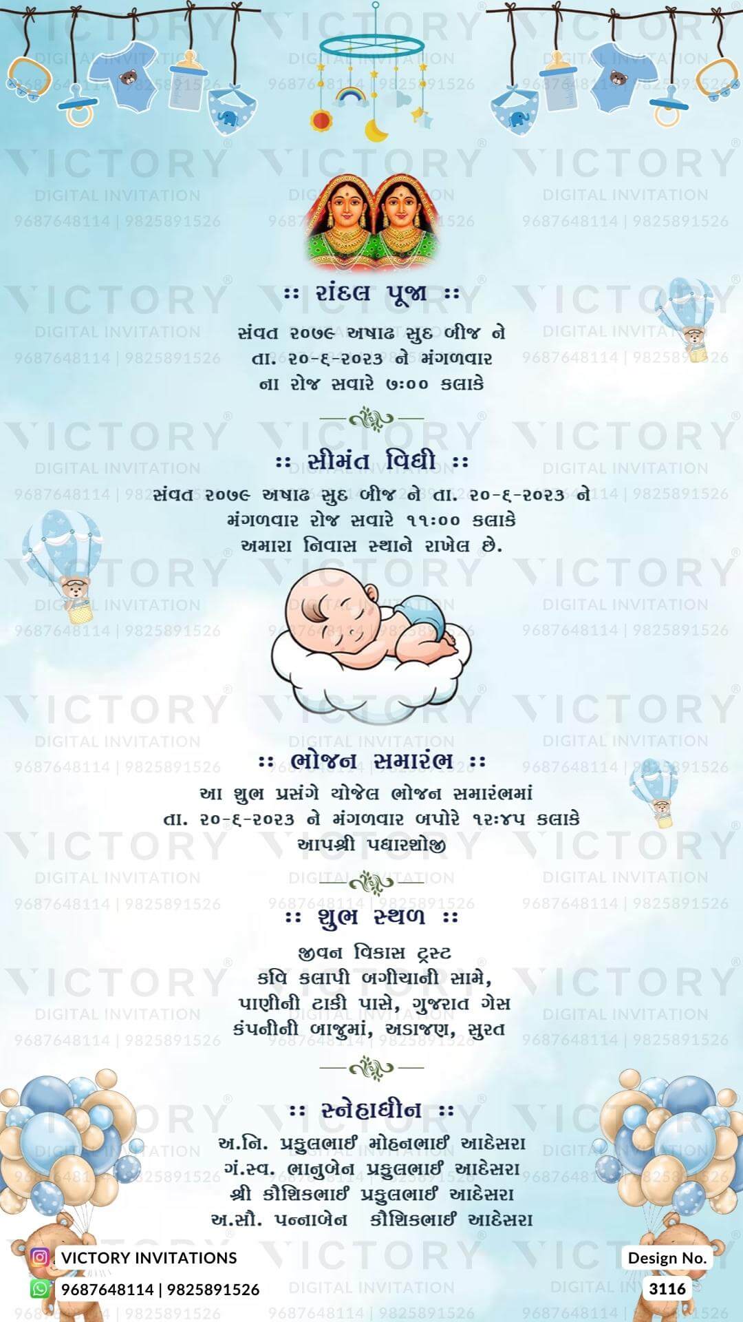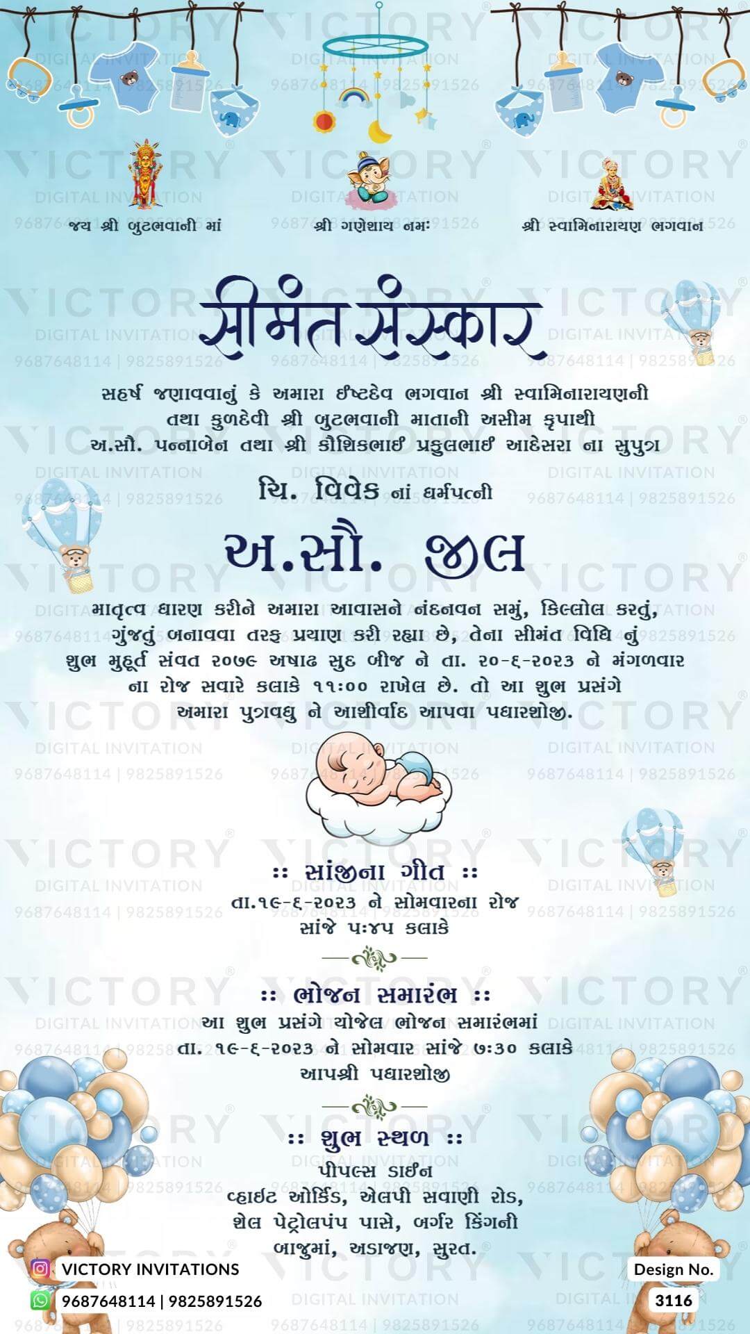 The playful Theme of the simant vidhi Baby Shower ceremony digital invitation card in the blue background color. This Simant Sanskar e-invite card is available in Gujarati language. Shrimant / Srimat card includes elements such as clothes, balloons, cloud, hot air balloons, teddy bear, and toys.