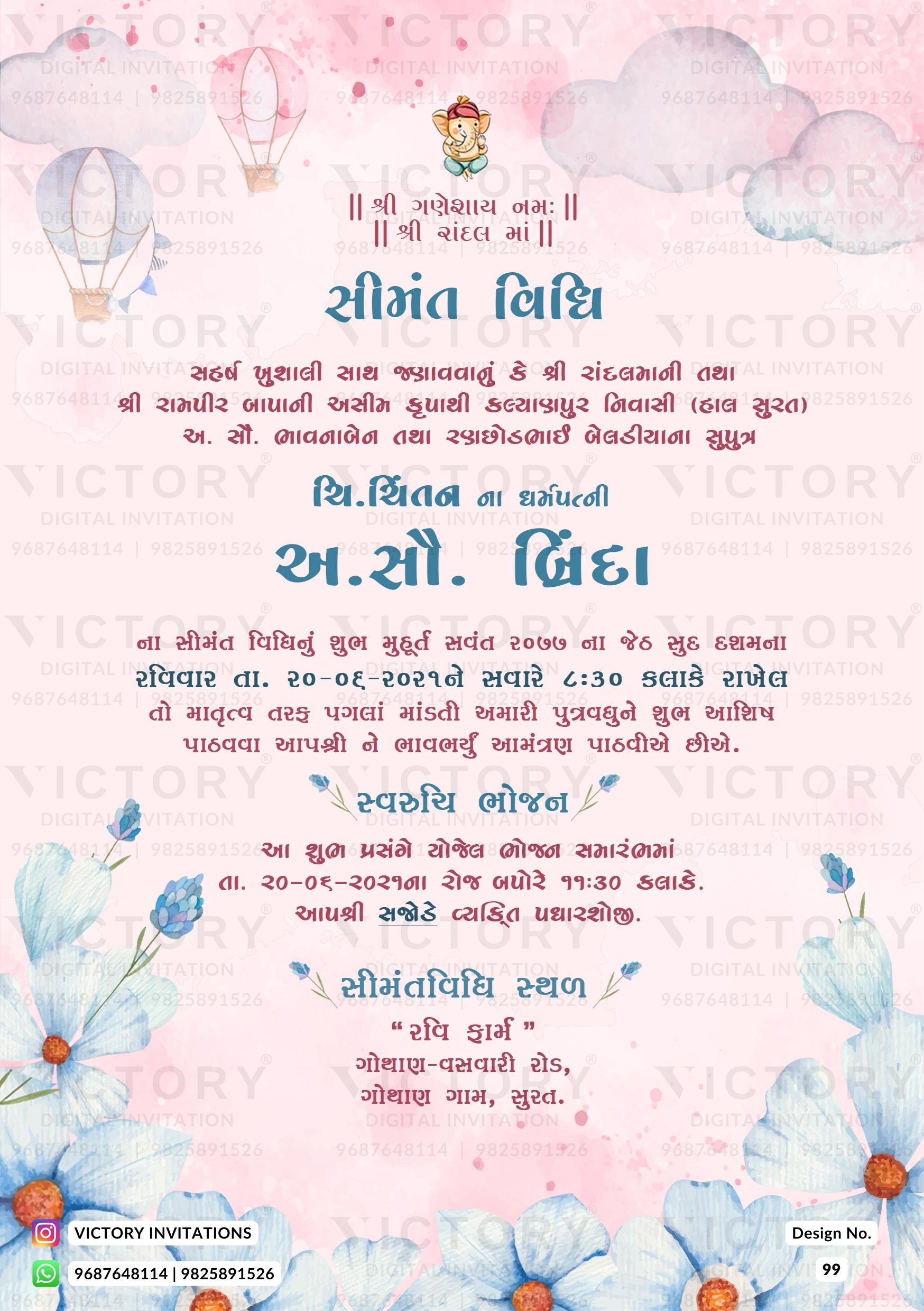 The floral Theme of the Simant Vidhi Baby Shower ceremony digital invitation card in pink background color. This Simant Sanskar e-invite card is available in Gujarati language. Shrimant / Srimat card includes elements such as blue flowers, hot air balloons, cloud, Ganesha logo, elephant, and blue ribbon.