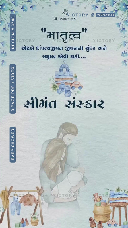 The floral Theme of simant vidhi Baby Shower ceremony digital invitation card in a blue splash background color. This Simant Sanskar e-invite card is available in Gujarati language. Shrimant / Srimat card includes elements such as blue flowers, a couple doodle, clothes, the Ganesha logo, shoes, and toys.
