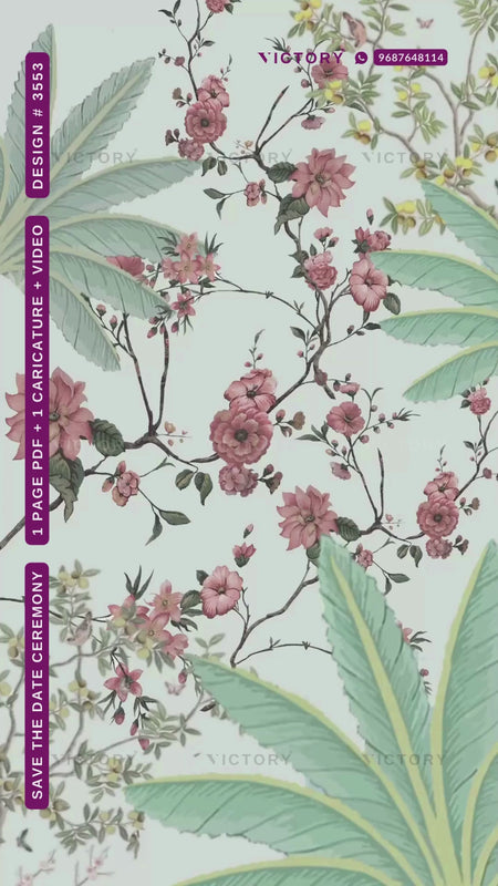 The traditional Theme of sitting adorable couple caricature digital invitation card for Save the Date in green background color. This e-invite card is available in the English language. Save the Date wedding cards include elements such as banana leaves, pink flowers, a swing, red flowers, yellow flowers, fence.