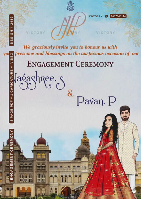 stylish couple caricature invitation card for Engagement ceremony in Englsih language with mahal as royal theme design 2419