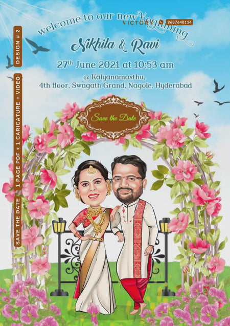 The garden Theme of Stylish couple caricature digital invitation card for Save the Date in sky blue background color. This e-invite card is available in English language. Save the Date wedding cards includes elements such as pink flowers, leaves, birds, fence, clouds.