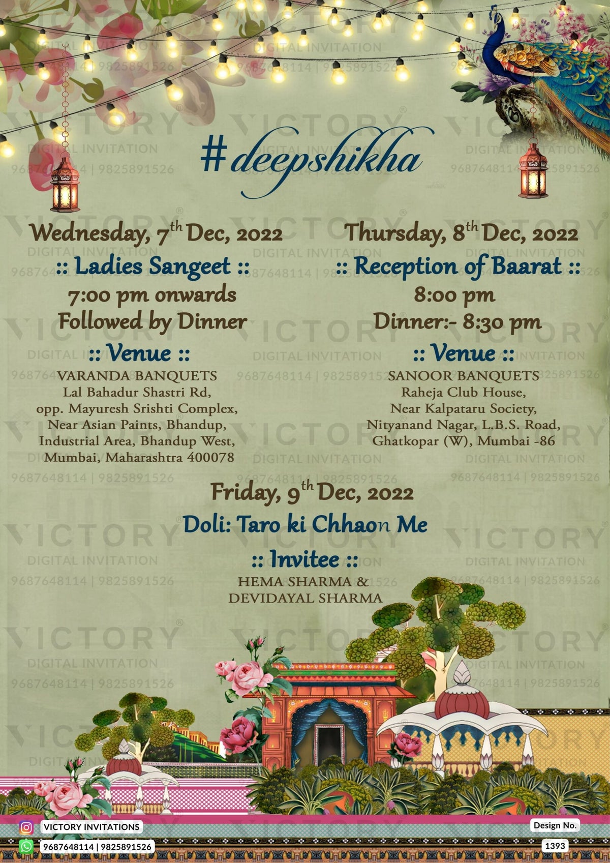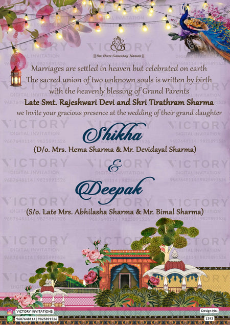 The Shining Theme of the Hindu Maharashtrian Stylish couple caricature digital invitation card for a wedding ceremony in pink, purple, and green background color. This e-invite card is perfectly suitable for the Marathi family and it's available in English language. It includes elements such as string lights, peacocks, lanterns, a country map, a tree, pink flowers, a Ganesha logo, a temple arch, a plane, heart line.