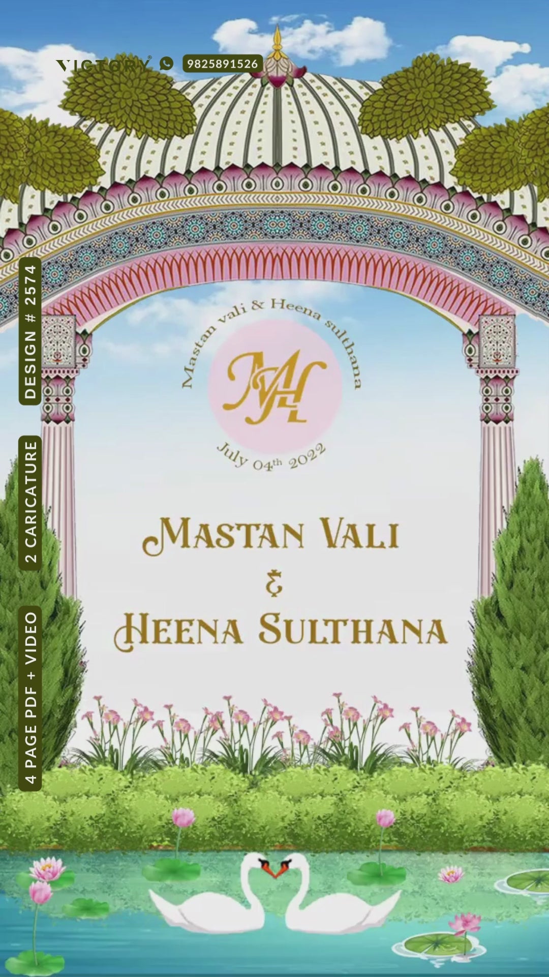 Stylish couple caricature invitation card for wedding ceremony of hindu south indian telugu family in english language with Garden Nigh theme design 2574