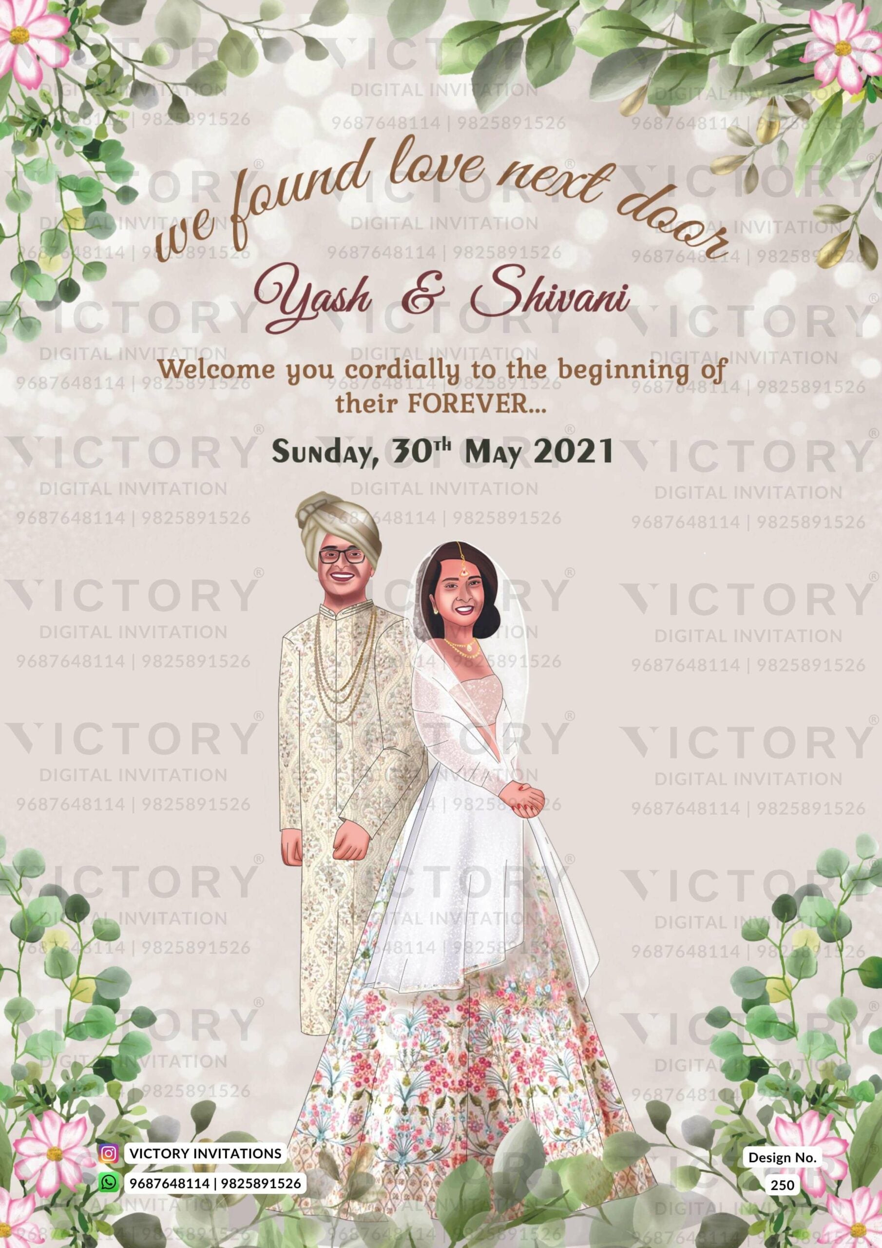 The Floral Vintage Theme of the Hindu maharatrian Traditional and Royal couple caricature digital invitation card for a wedding ceremony in a Pastel Brown background color. This e-invite card is perfectly suitable for the marathi family and it's available in English language.It includes elements such as Birds, red and pink flowers, green leaves, the god logo, Om symbol.